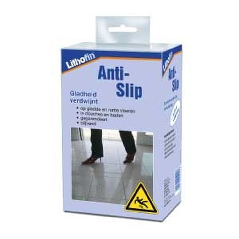 Lithofin anti-slip is een 4-delige set (250ml speciale reiniger, 250ml anti-slip product, 2 dubbelsponsjes, beschermhandschoenen) goed voor het ruw maken van 6m² oppervlakte. De gladheid verdwijnt op gladde en natte vloeren, in douches en baden en is gegarandeerd blijvend!